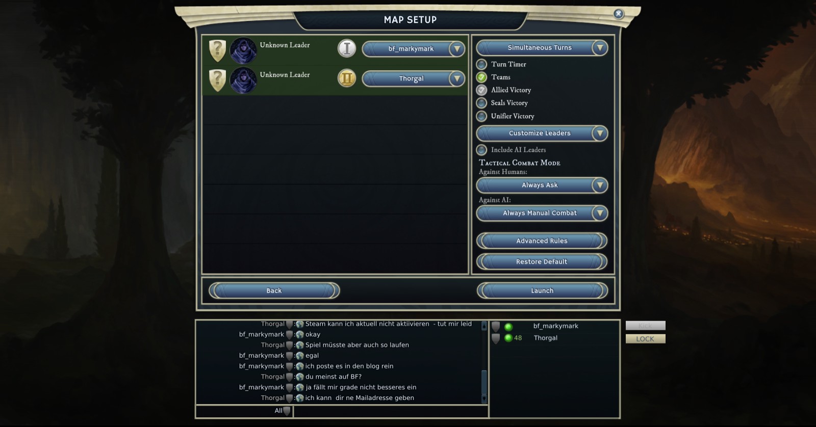 Want Play a duel or Team duel (2on2), but shall be a live Multiplayer game, not a PBEM. When possible without timer (when all promise to Play fast).