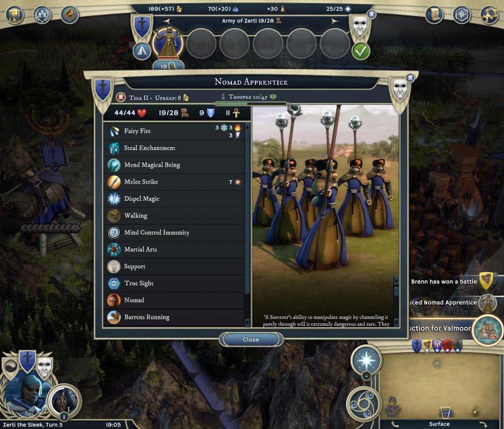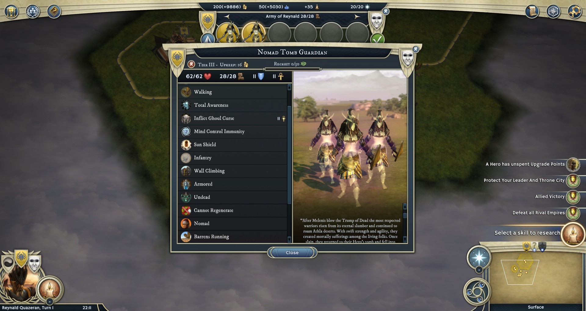 If anyone yet has reached tier II on the racial governance tree there is an option to add the 8th unit which is the Genie that can be produced from the Great Temple much like the Tame troll on the Goblin tree that also adds the 8th unit. The Genie is a magical origin that can serve a little support role if necessary and I hope it's not too strong as it gains magical mending and healing at the same time.