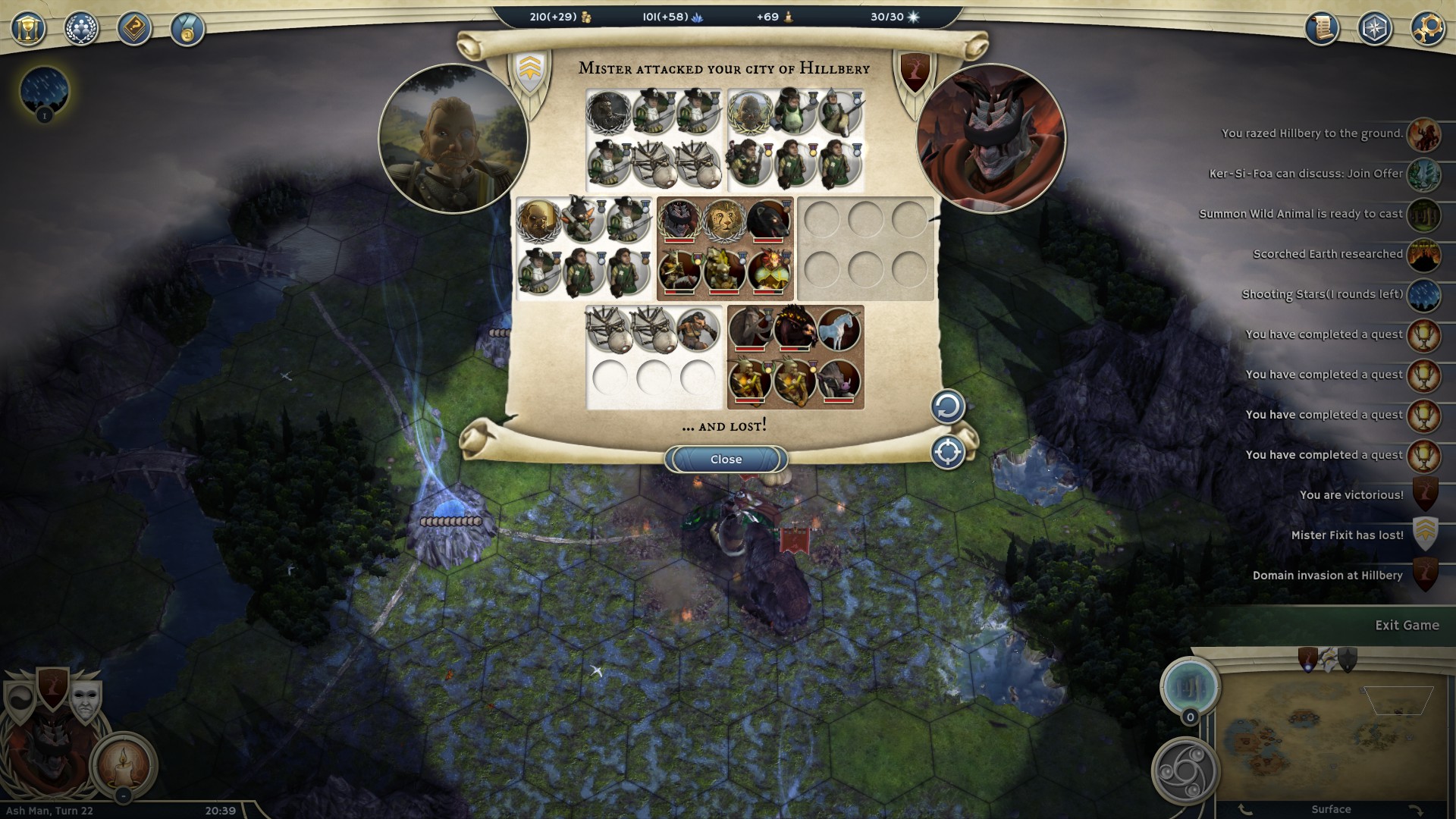 All in all the match did not go too badly for me. Of course losing a fortress along with builder was a setback but at least I was able to kill off some hunters in return. I had shitloads of mana (3 nodes in starting area) so I invested a bit in CP and spammed drones. I picked my fights carefully and did not lose any units apart from the occasional scout. Major gripe of this game was that I could not find any scrolls (except 1 turn before defeat a mile all the way across the map) while I had half the map explored and about 20 & of underground. This was terrible for my research, since my strategy with these settings is to research 40 and leave 5 of everything and then exploit scrolls.