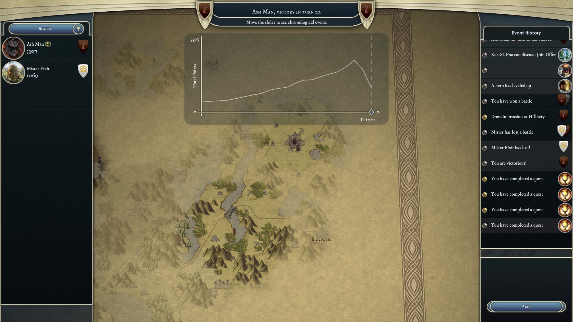 As you can see from the scores, the game was pretty even until my successfull aggression. I was so unsure of the final battle that I even sent Sheila's mount to my 2nd hero beforehand so in case I lost he would be a better stack leader for the shamans I was pumping out, but turns out that was unnecessary.