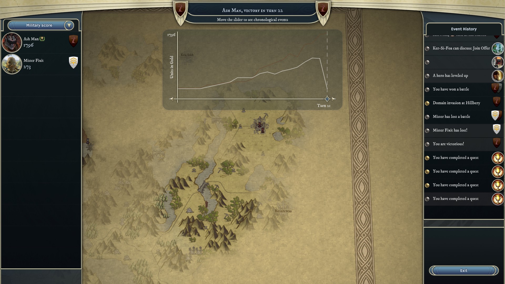 Even though I didn't clear that many sites, through chain lightning spam Sheila was leveled to 11 and Static Electricity just in time for the final battle. I took his capital one turn before he reached it to defend it, and began razing it. I was a bit hesitant to stay and defend against a larger (albeit inferior) halfling force during a shooting stars event, but turns out the lucky RNG might have even favored me more than him in the actual autobattle. This combined with Static Electricity (though after casting it, the marvellous AI tried its best to get her killed and eventually succeeded, ending the effect) sealed me the victory in the final (and only noteworthy) battle.