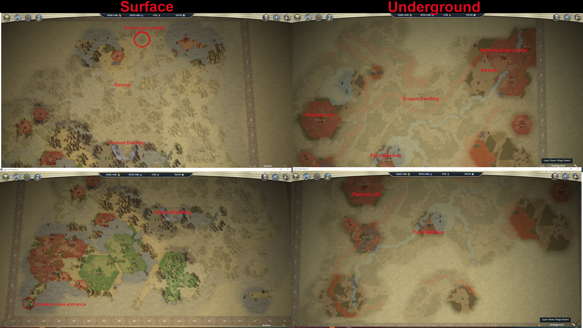 So after Thorgal and me both found our first city and annexed the nearby town our game plan was for me to take the long route ferrying over towards my realms northern shore while Thorgal would push towards the Undead dwelling, I would hopefully be able to evolve a few of my cavalry units into knights, meet up with him at the undead dwelling and together we could start pressuring into their territory. Once I shuffled my troops over the sea I also split my armies into an Underground stack lead by a Goblin Archdruid and my main stack with a Dwarven sorceror and my leader. It went pretty ok, I lost a knight and a silver cavalry clearing sites, but my underground stack found a human settlement I could vassalize and a bit later even a dwarven city. Meanwhile a somewhat fierce scout war had erupted, personian was relentlessly sending cherubs at us. But with Thorgals generous mana support for my drones and his Monster hunters I think we prevailed quite fine, I don’t know how many drones exploded and cherubs went to heaven during that phase, it was a lot. Nonetheless Thorgal managed to secure the Undead dwelling and we spotted Personians main army near it. But when I finally arrived with my main army we had lost track of it again. By this time we knew that Personian had vassalized the central dragon dwelling in the UG which we thought was a pretty pretty strong gatekeeper towards their (suspected) Underground realm. We were also aware of Sleeping Dogs booming and thought that both were bunkering in the Underground trying to snowball away with conversions and a superior economy. If that was their plan it was working wonderfully, we hadn’t really scouted their realm yet because we were too busy deflecting personians cherubs and the only thing we saw was a vassalized dragon dwelling in the central underground that guarded the suspected access to their realm.