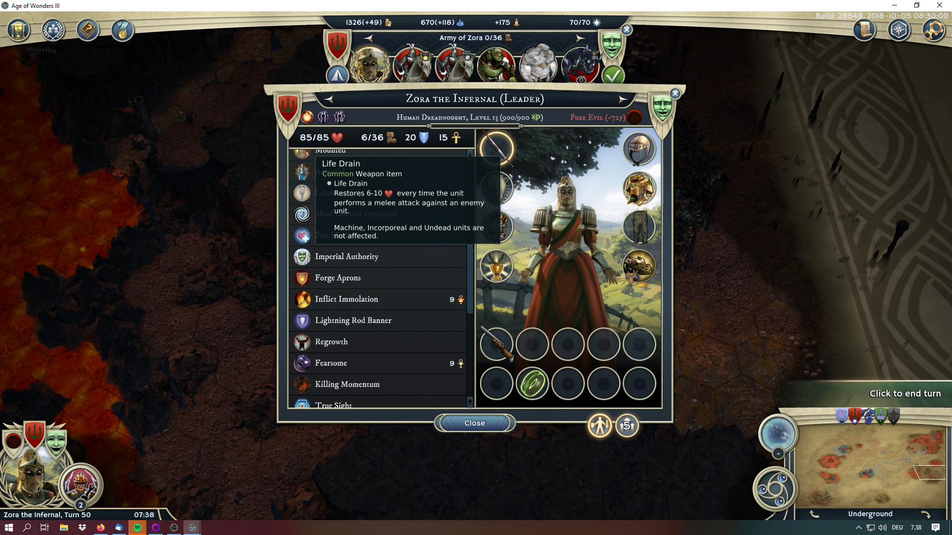 But for me it went splendid. I was shadowborn master and Entwined by Shadows was up and running, my main army sharking around their realm cleared quite a few sites and got a few more extra units from sites, summons and an Inn which would fill the army up to 3 full stacks again and my leader was turning into a melee monster with regen, 20 defense, 15 res, regen (item), killing spree (item) and tireless. The only thing I didn’t get was “Rite of Malediction†in my spellbook, even though I was fishing quite hard for it.