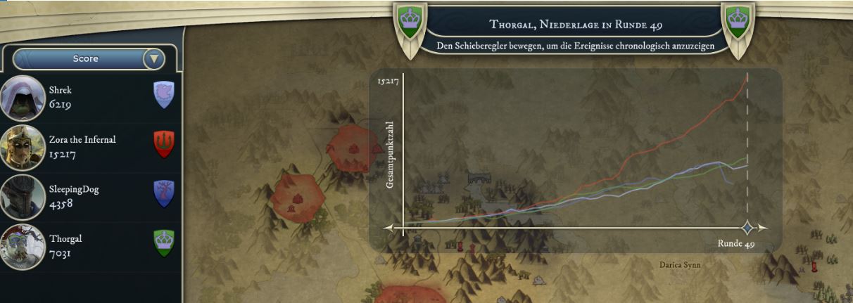 It was a good game though quite long. I think Personian and Sleeping dog had a real chance if they had managed to lau nch an attack earlier on our eastern flank when Thorgal was struggeling hard and or being more aggressive in the Underground, my fairy dwelling, my dwarven city and my human vassal all were completely unmolested for the whole 50 turns against a booming goblin dreadnought that was pumping cavalry, there really should have been the speed and manpower to contest and pressure our half of the UG.