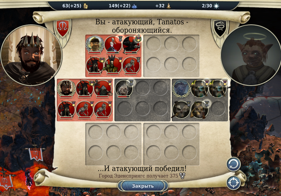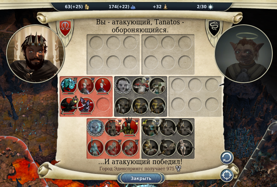 His leader returned back on turn 22 and ran away from my approaching army. He blocked bridge with two stacks trying to save his leader, so I was able to attack him with only one ground stack. But I had 5 floating/flying units and so it was 11 vs 12 battle.
