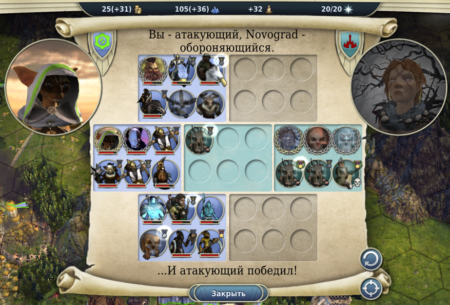 Anyway I decided to capture his independent and raze it or join it and sit there behind walls. Approaching the city, I discovered that Novograd's army is also close to it. I decided to stick the same plan and prepared to sieging city. He could took it, but it had quite strong and dangerous defenders, so I thought his army would be seriously wounded after that and I could try to kill it. Anyway it didn't happen. Next turn I got quest from this city I wanted to attack, completed it and get eagle rider as a reward. Then I bought 3 units from nearby inn, captured city I just made a peace and sit there. I had almost 3 stacks behind walls, many of them were ranged and I had very high chances to win even my army was wounded.
