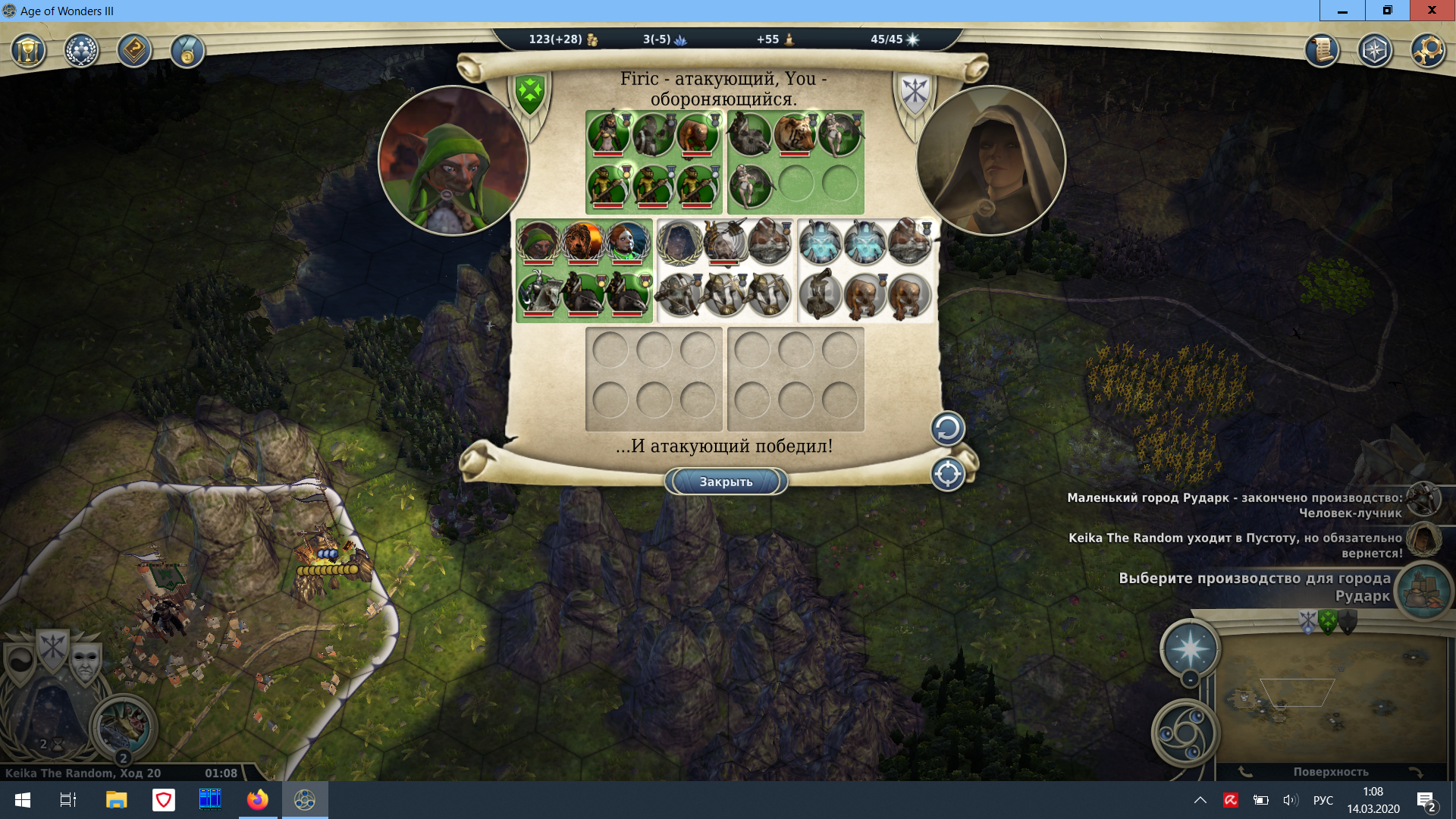I had 4 wisps and gryphon scouting the map, but didn't scout underground well. It looks like there was relatively short way between our cities (or mahimka digged it towards to me) and I was a bit unprepared because of bad scouting. Additional issue were roaming independents. I cleared 3 camps near my cities, but somewhere there was also hidden monster den far enough which I didn't find. I thought my city was guarded well (2 civic guards behind wooden walls), but I was mistaken and I lost my city.