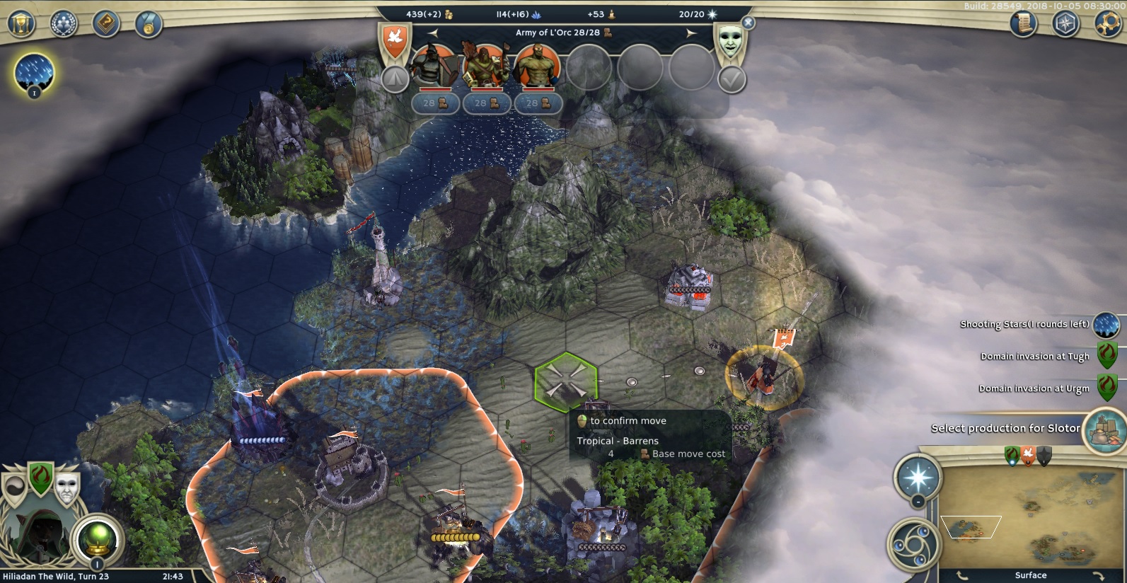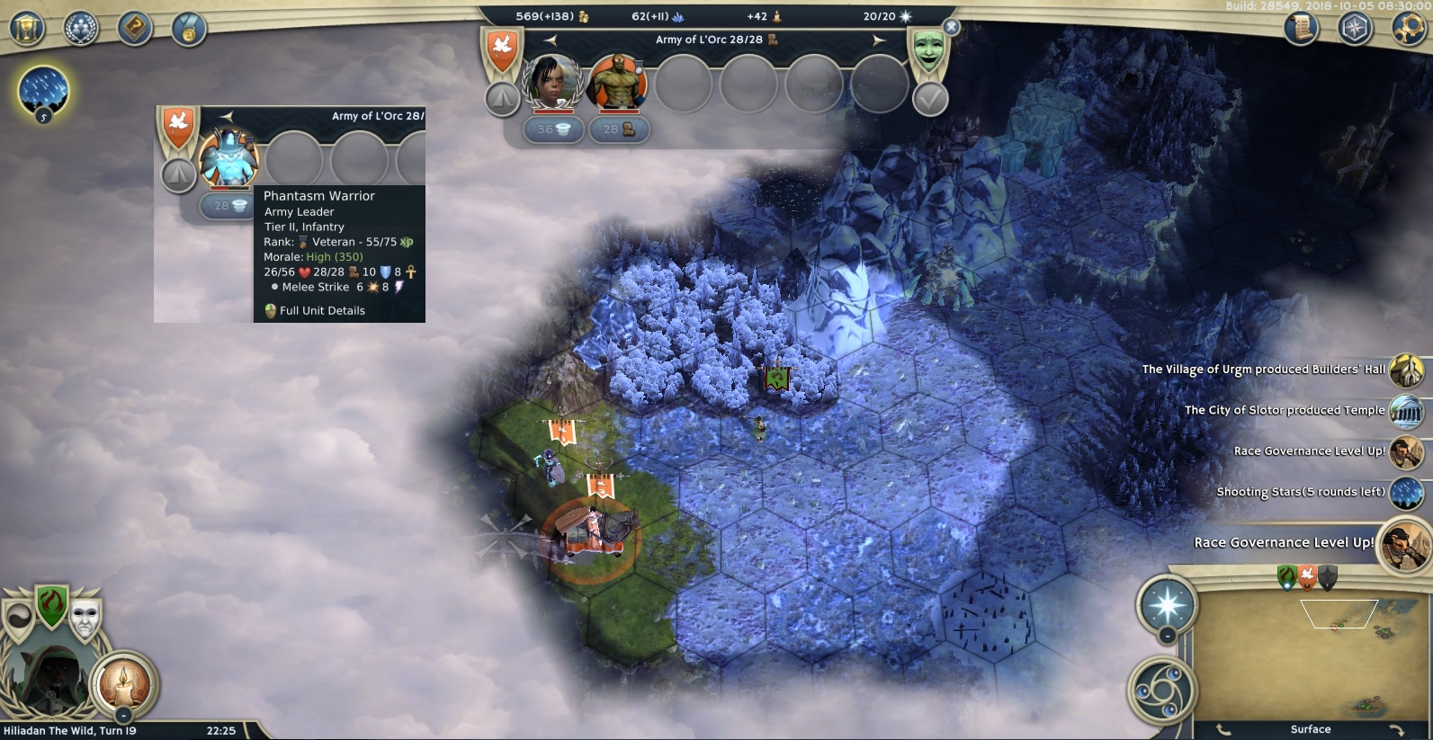But clearing stuff went quite well afterwards, I was levelling hard and I had some luck with my conversions. When I learned your race and class I knew I had to hurry before you would grow too big. I could tell you invested in building new cities, so I thought that would have slowed you down enough so that I conquer you. But, so many units! The concealment was very annoying too... And I did not want to raze your cities with my good alignment...