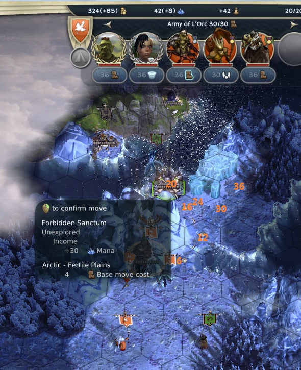 We met around turn 13 and I started killing Spirit's Cherubs which he dispatched a bit too carelessly to places where I could reach them (I was lucky to have built a Hunter just in time!). The Cherubs had appeared UG and he was playing Orc so I was really unsure where he had started: UG or surface? I thought UG so I tried to send troops there to find him. He had vassaled a Fey Dwelling and then later on a Giant Dwelling UG, so I was reinforced in my belief that he was there.