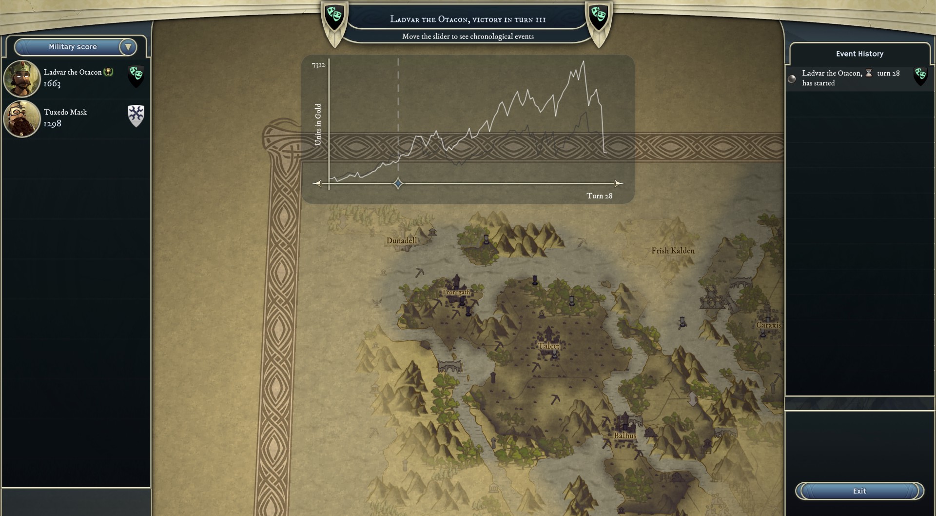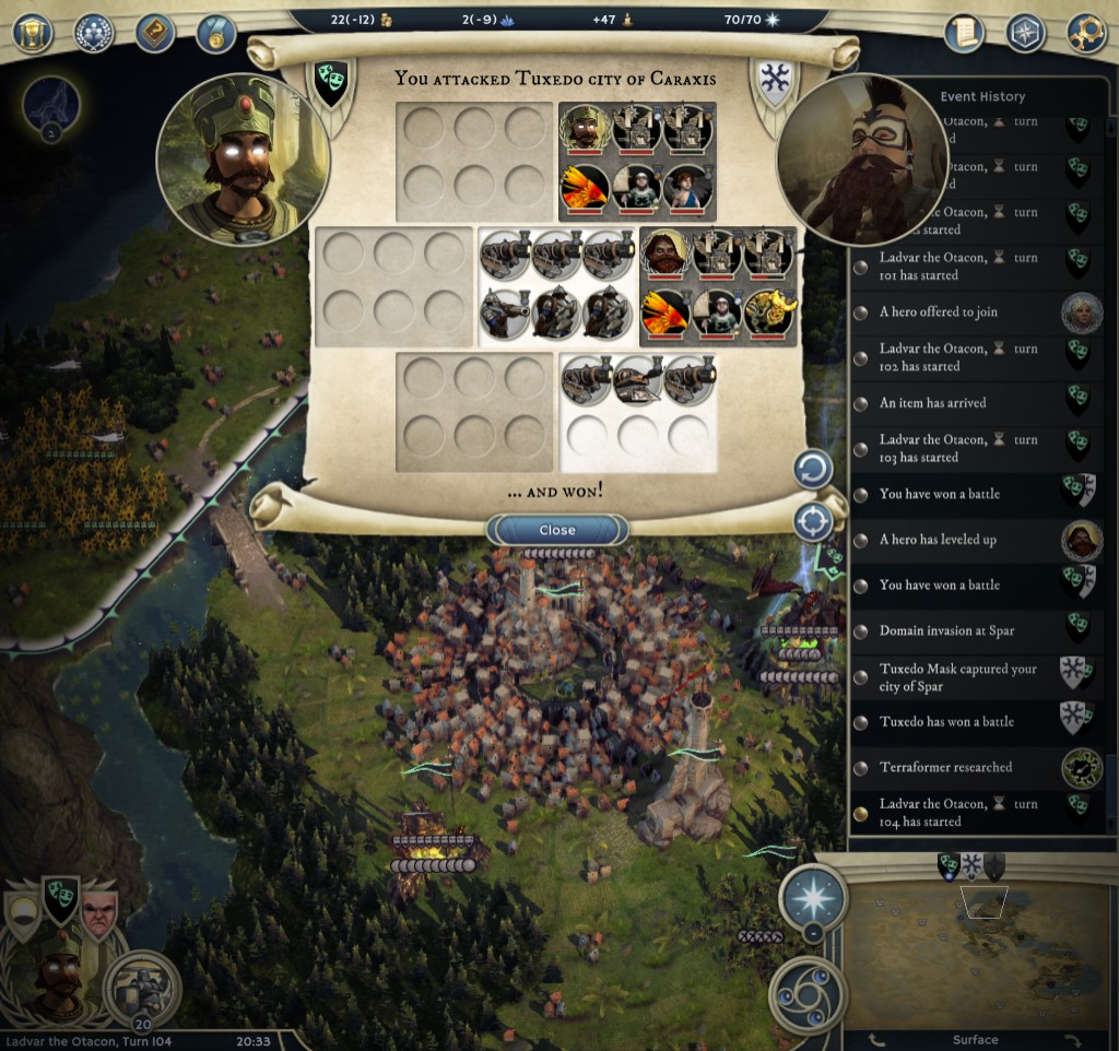 From my side, as Refineus said, I had a very bad start, I just was not used to play with dreadnought at all, so at the beginning it was very hard to me to clear some of the sites, I ended up loosing all my initial stack, so my first 6 turns were just building my stack again, which now with archers and cavalry made everything much easier. Since Refineus had a very good scouting, by turn 15~, I was very afraid that he would realize that I had nothing to defend myself, at some point, when I lost my leader if he had attacked me full force, I think it would've been an early win for him.