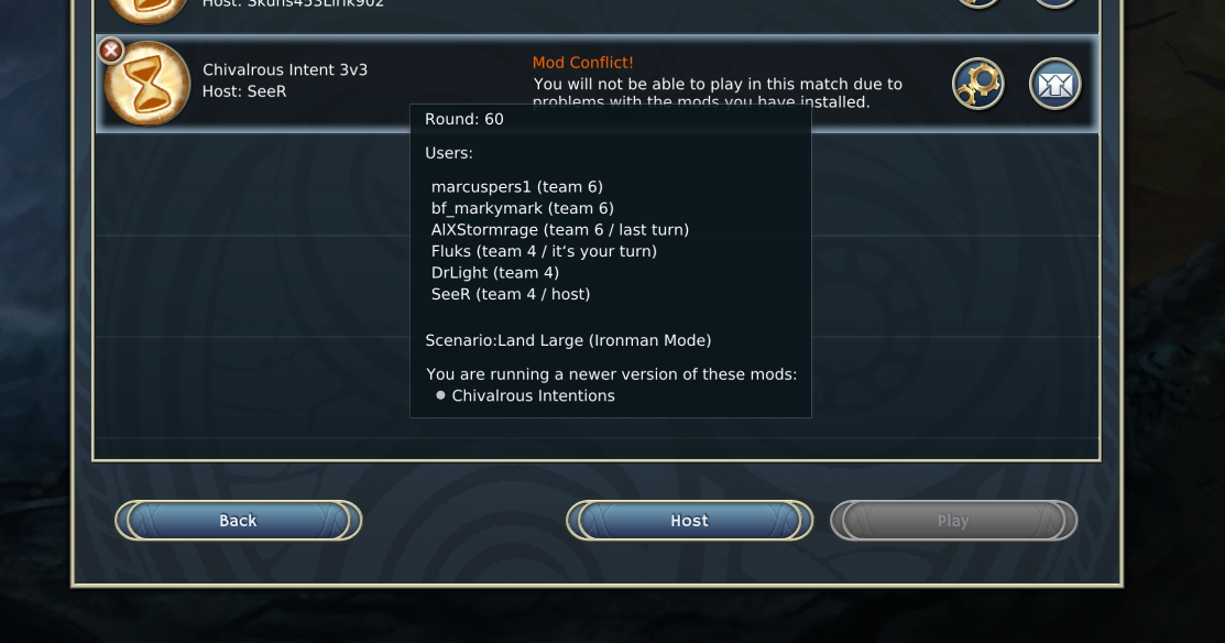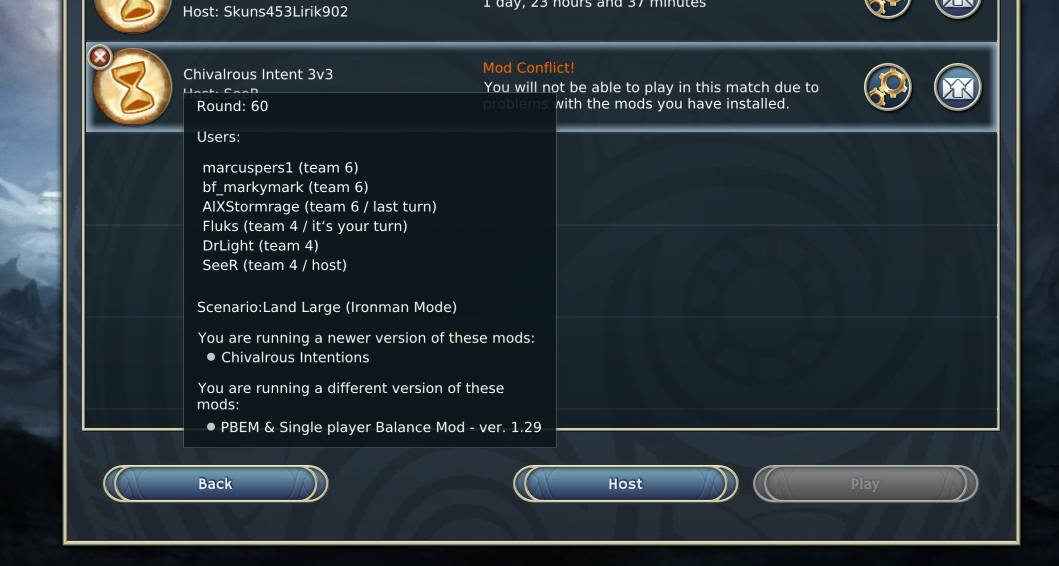 This was a great game! Thanks to all involved and especially $eer who hosted it. it was my first game with loads of mods I hadn't played before and it was a blast. Also as others have noted everyone usually played their turns really quick which helped. Only "annoyance" was that this chivalrous intentions mod kept getting updated and I have the game on gog - I just checked on the mods steam page - since we started there have been more than 60 updates for this mod and it sure feels like I manually downloaded and unpacked every single one of them