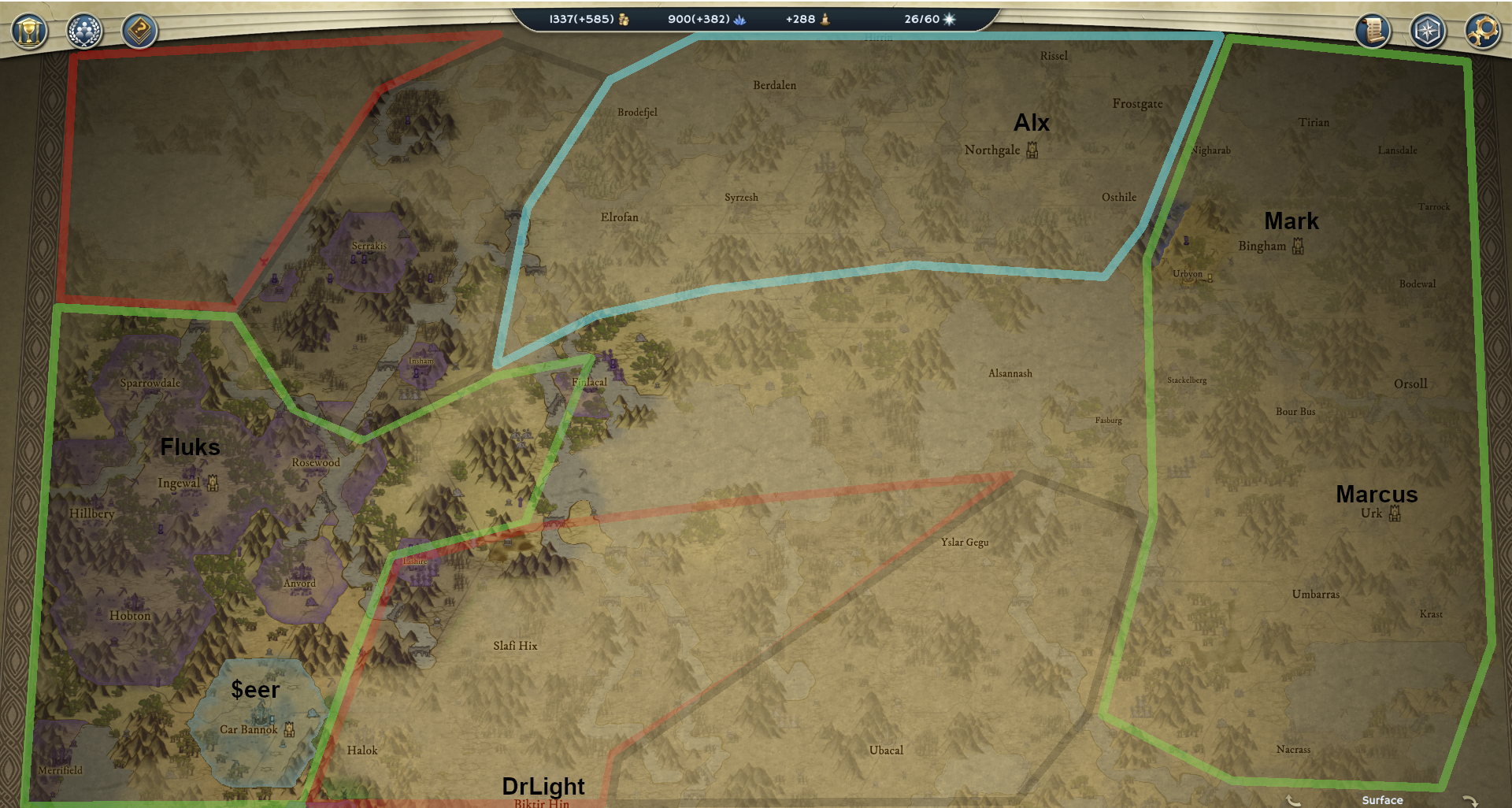 Of course I didn't know that from the beginning, once the situation became properly clear to me I just beelined stalkers and tried to mix in some leprechauns for good measure. But of course at that point I had already spent a lot of research into the explorer tree to make my T1 rogues quicker and see further and together with my overall slow start it took forever to finally get stalkers. At that point Alx was already pressuring hard with a lvl 13 theocrat and three stacks from the north razed my two dwarven towns and continuously threatened to take the Naga dwelling (Serrakis). I managed to defend (also thanks to my allies, for about 3 turns I just received spare resources to bring me above 1000 gold for the happiness boost) but thats about it, in the meantime $eer and DrLight lost ground in the south and we never really managed to put pressure on them.