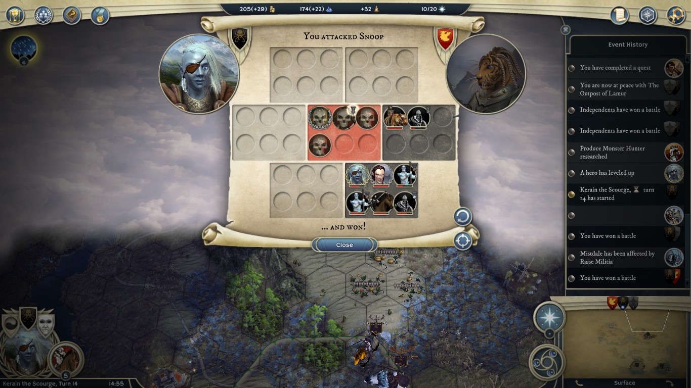 Around turn 9 I started advancing toward DrLight's domain because I felt confident about my two stacks and that DrLight didn't have too much from the little scouting I managed to do. Most of my Scouts got eaten by Independants before they could find DrLight's leader and army. He also didn't have his racial Independant vassalized at that time. On the way, I lost my first Arch Druid hero, so I struggled with keeping my units healthy. Fortunately I got offered a new Arch Druid a few turns later.