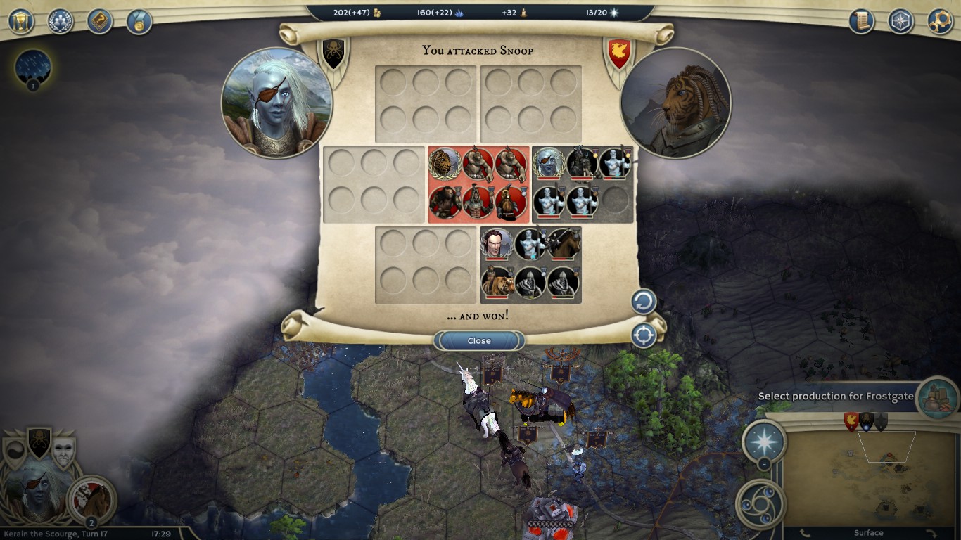 I completed a quest for a T2 reward for the that Tigran settlement just before DrLight finally vassalized it, after which I took the town. I took a detour to eat some melons when DrLight decided to send a small army, lead by hero, to retake the Tigran settlement. Unfortunately, for him, I wasn't even a turn away. I defeat the stack without any problem, then as I was spending my remaining movement to follow the road, hopefully leading to his throne, I stumbled upon his leader army, which was also only a stack. It had two Ogres but I could defeat this stack too without major losses.