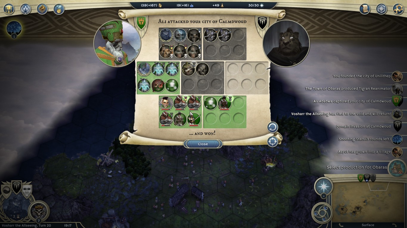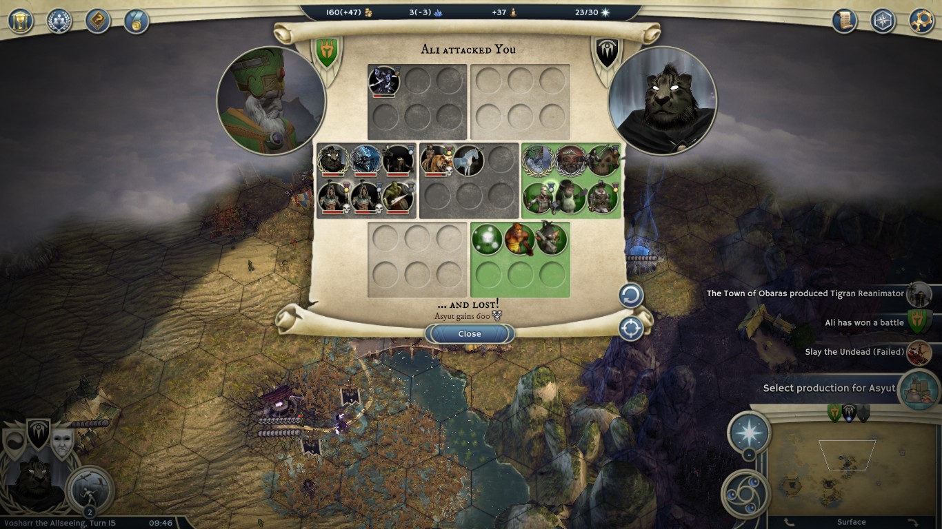 Since his main army seemed to be out of the way I advanced on his cities. I took two of them. I should have just tried to raze both, maybe then I could have done some lasting damage. As it turned out, he had a bigger army still, which, with his leader back from the void, he defeated mine. I also have to note that again I didn't know when to run. Or.. I knew but I still didn't, and took my chances.