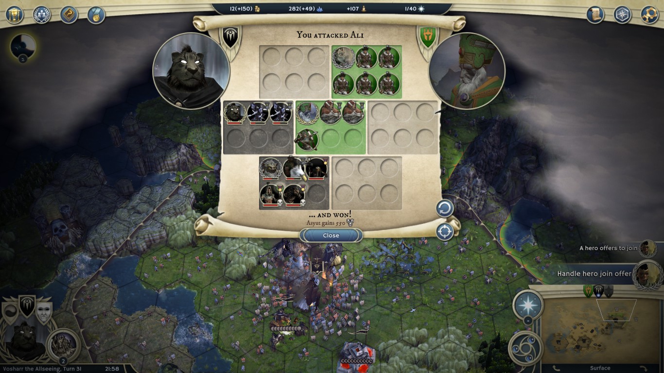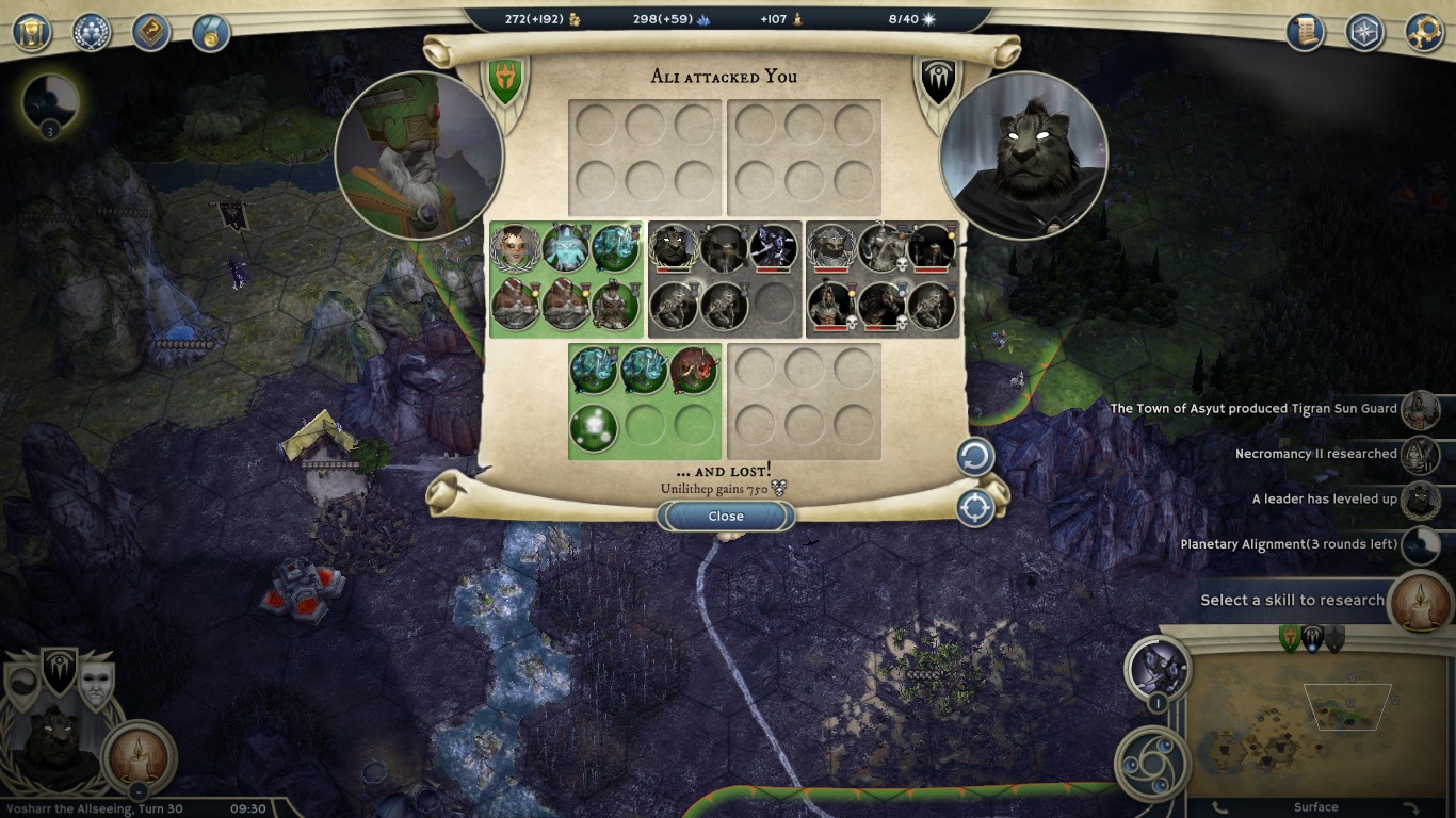 I think I lost this game due to poor strategic choices, I had a real good start, I was able to level my heroes and leader decently and didn't lose too many units. I was expanding rapidly and getting some good units from the dragon dwelling. I did all well until about turn 15, I started to get greedy with the structures I was taking and lost too many of the tier 2 dragons I got from the dwelling, also lost some apprentices trying to take a tomb. I couldn't scout Sin's territory very well so I was blind on how his economy was.
