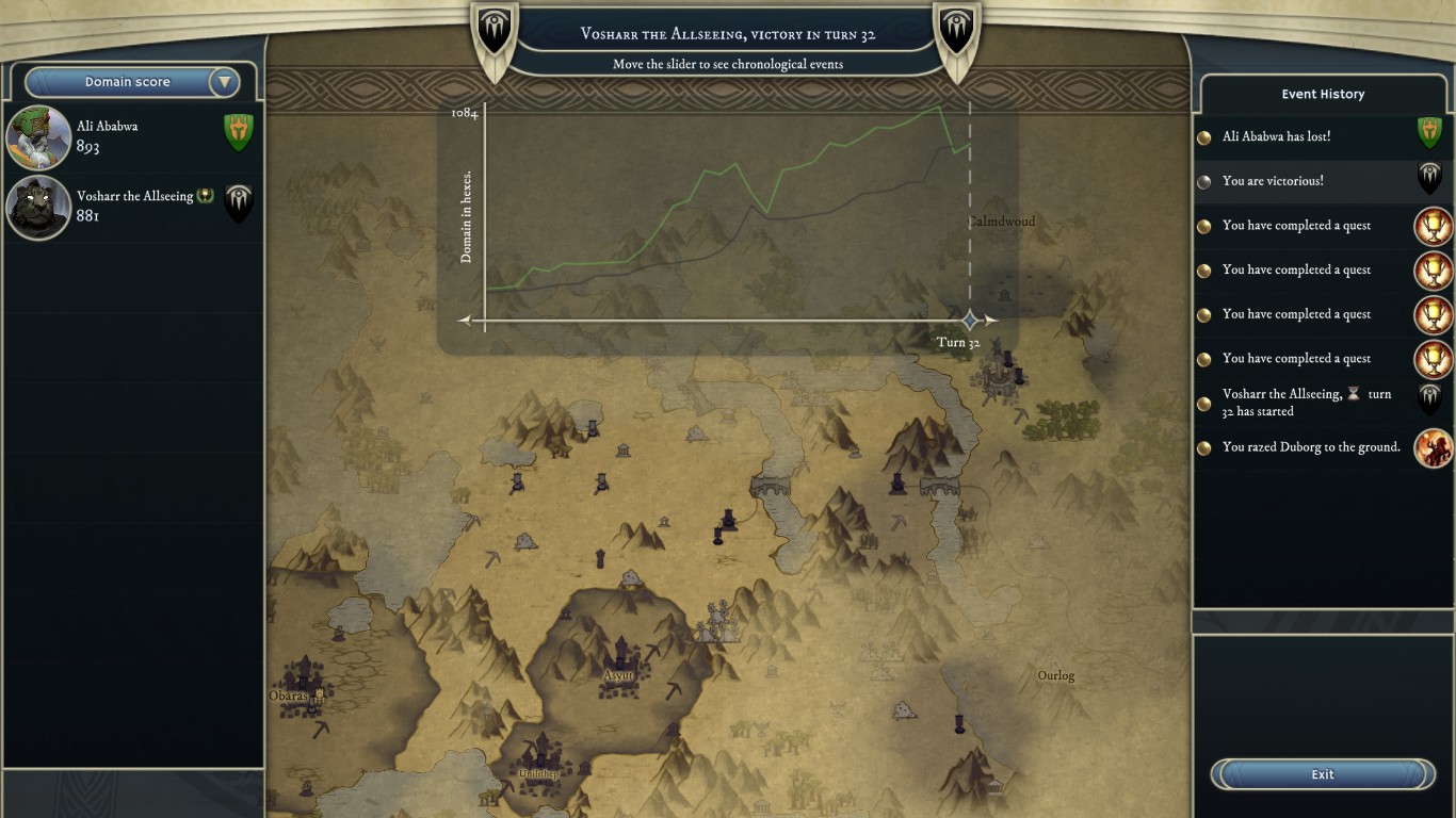 At this point, DrLight had two expansion and a dwelling, I was aware of. In comparison, I felt my economy (same amount but smaller settlements) was really bad, so I expected that on the long run he would out-produce me. I also had few units left after that battle but fortunately I could buy the T3 and a T2 from the Tavern, DrLight had cleared, sooner than he. So with those I thought I might have a chance against him if he marches against me immediately. He didn't.